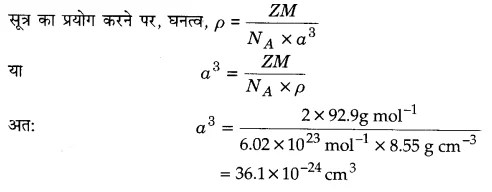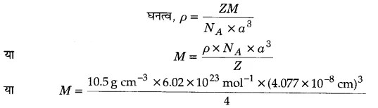 चाँदी घनीय संवृत संकुलन (ccp) जालक बनाती है। इसके क्रिस्टल की x – किरण जाँच से ज्ञात हुआ कि इसके एकक सेल के कोर की लम्बाई 408.6 pm है। चाँदी के घनत्व की गणना कीजिए। (चाँदी का परमाणु द्रव्यमान = 107.9)