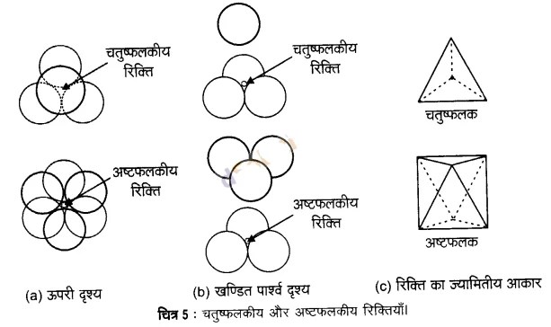 (ख) तृतीय परत को द्वितीय परत पर इस प्रकार रखा जा सकता है कि गोले अष्टफलकीय रिक्तियों को आच्छादित करते हों। इस प्रकार से रखने पर तृतीय परत के गोले प्रथम अथवा द्वितीय किसी भी परत के साथ संरेखित नहीं होते। इस व्यवस्था को ‘C’ प्रकार कहा जाता है। केवल चौथी (UPBoardSolutions.com) परत रखने पर उसके गोले प्रथम परत के गोलों के साथ संरेखित होते हैं। इस प्रकार के पैटर्न को प्राय: ABCABC…. लिखा जाता है। इस संरचना को घनीय निविड संकुलित संरचना (ccp) अथवा फलक-केन्द्रित घनीय (fcc) संरचना कहा जाता है। कुछ धातुएँ जैसे ताँबा तथा चाँदी इस संरचना में क्रिस्टलीकृत होते हैं।