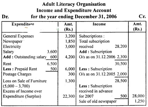 Subscription outstanding on 31st December, 2005 is Rs. 1,200 and Rs. 2,300 on 31.12.2006, opening stock of postage stamps is Rs. 300 and closing stock is Rs. 200, Rent Rs. 1,500 related to 2005 and Rs. 1,500 is still unpaid.